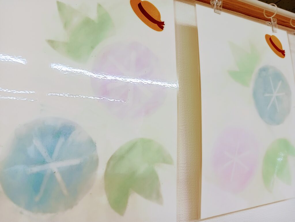 完成した作品を見て、ひとりのお子さんがぱっと顔を輝かせて「あさがおだ!」と叫んだその笑顔が、私たちにとっての一番のご褒美でした! みんなの指先から咲いたあさがおは、どれも個性たっぷり!夏の風物詩が見事に融合した作品になりました。