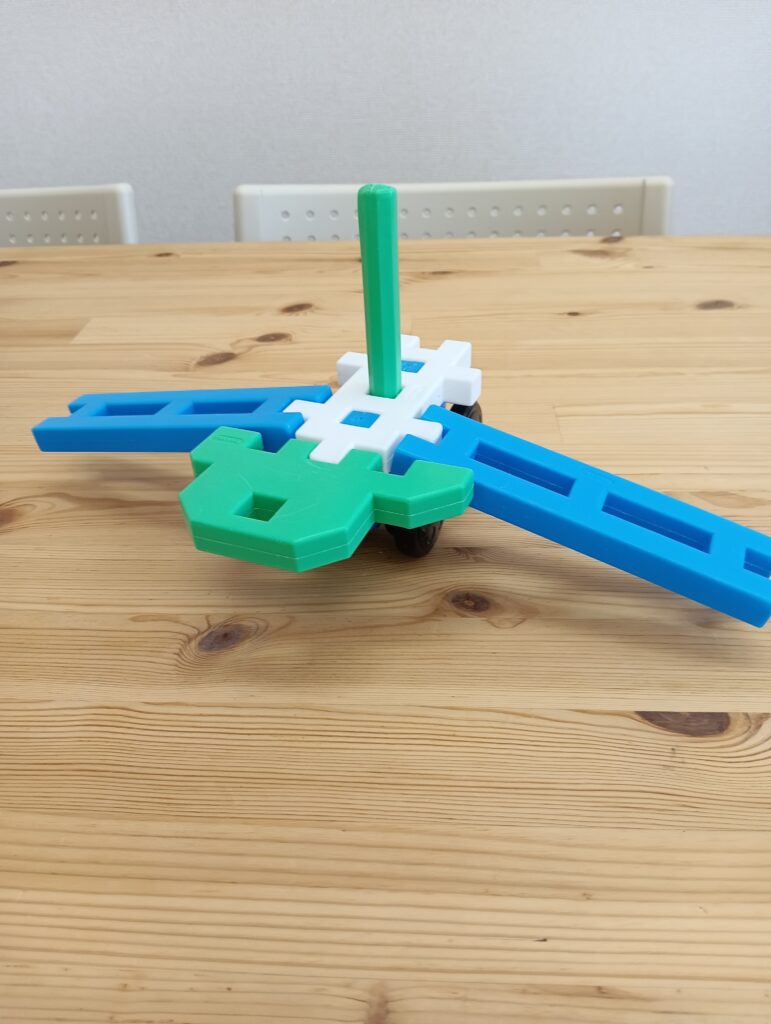 子ども達は、様々な形をしたブロックを手に取ると、縦や横に繋げていき、乗り物や建物を作って楽しんでいます。