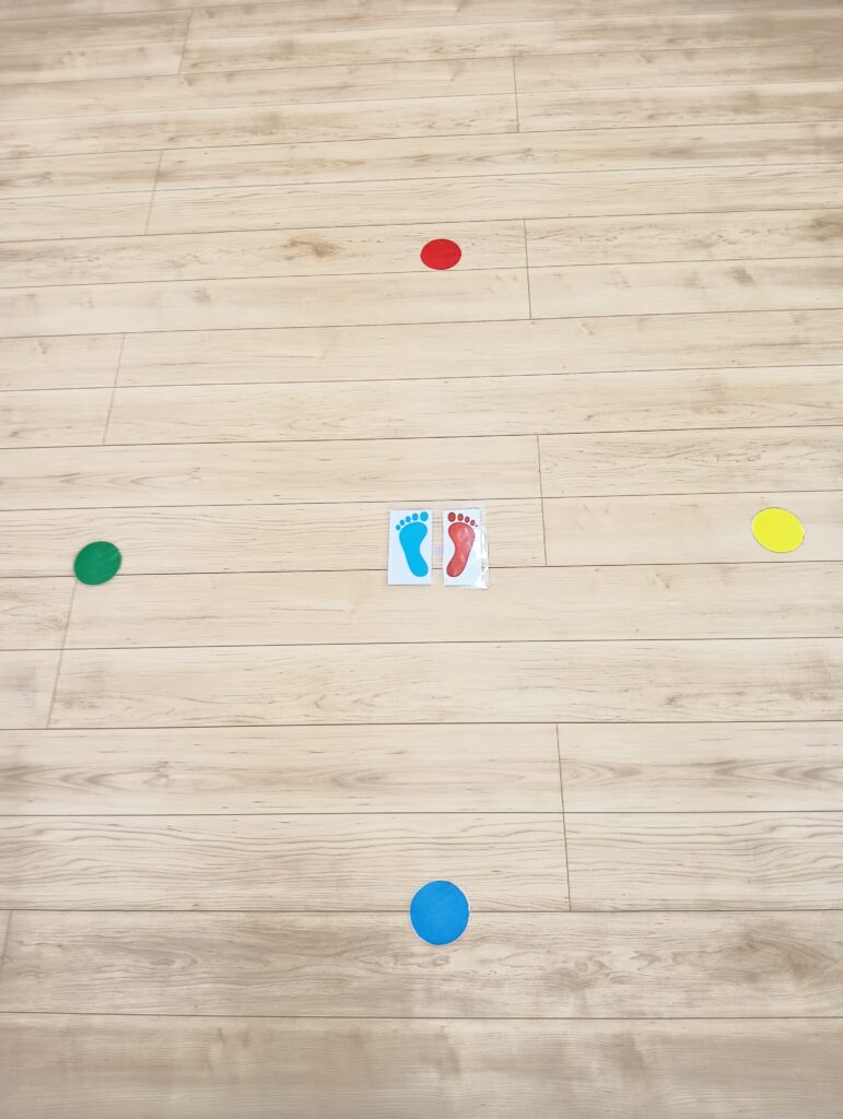 ルールはとってもシンプル。 職員が伝えた色を聞き、前後左右に置かれた色カードをタッチ! タッチしたら、すぐに真ん中の位置に戻ります。