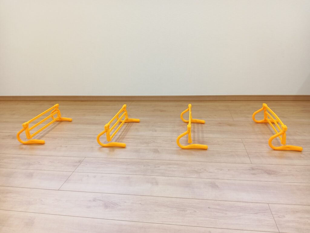 まずは、片足ずつ歩くようにハードルを越えて着地するジャンプからスタート。
