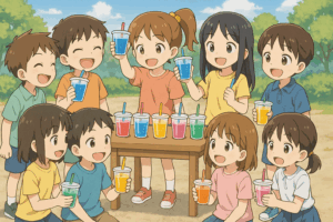 「ピンク!」「オレンジ!」と、好きな色を元気いっぱいに選ぶ子どもたち。2色、3色と重ねていくうちに、思いがけないグラデーションが生まれます。