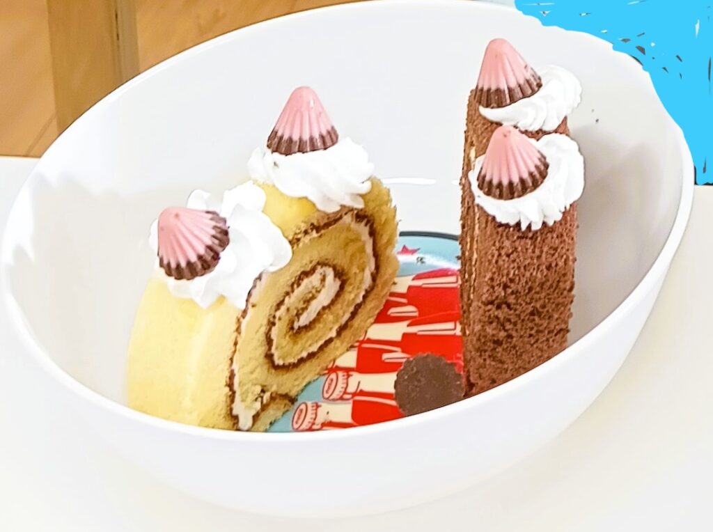 おやつタイムは、ロールケーキを使ってミニケーキ作りに挑戦! チョコ味とプレーン味のケーキに、生クリームをたっぷりのせて、アポロチョコやプリッツなどでかわいくデコレーションしました。